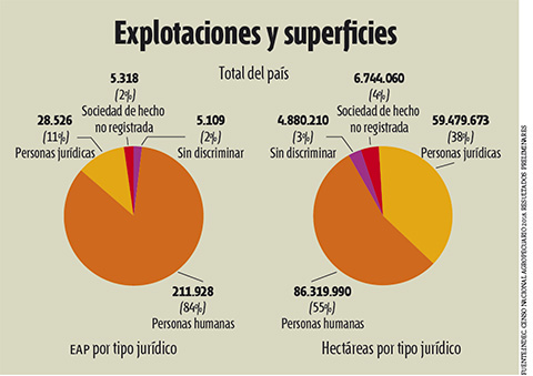 En cuanto a la superficie promedio de  explotación (que pasó de 520 hectáreas en el CNA 2002 a 627,5 hoy) el censo releva que la mayor cantidad de explotaciones agropecuarias (EAP) en el país están entre las 100 y las 500 hectáreas, extensión que incluso en las zonas más productivas apenas alcanza para sobrevivir: 57.856 productores que representan el 25% del total y que suman 14 millones de hectáreas de los 157 millones. Mientras que en el otro extremo, unas 2.500 EAP (en su mayoría personas jurídicas, grandes empresas agropecuarias), apenas 1% de las 250.000 explotaciones registradas, manejan cerca del 40% de las tierras productivas del país. Este dato surge de la segmentación de las Explotaciones Agropecuarias según su escala productiva. Los 1.610 establecimientos que tienen entre 10.000 y 20.000 hectáreas cada uno (que suman 23 millones de hectáreas) y las 863 explotaciones que tienen más de 20.000 hectáreas, concentran otras 34 millones de hectáreas, y suman cerca de 58 millones de hectáreas, el 36% de la superficie censada.