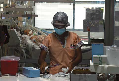 Recursos escasos. Faltan camas y las unidades de terapia intensiva trabajan al límite tras el aumento exponencial de casos de mediados de abril. (Télam)