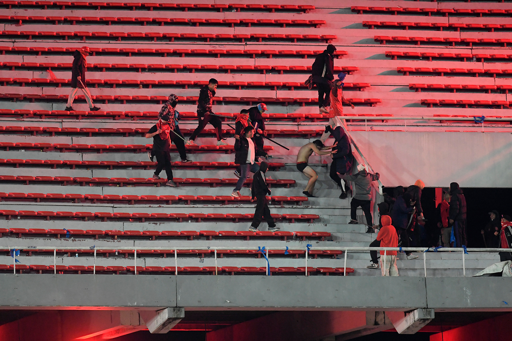 Desde temprano, incluso antes del partido, la barra chilena generó destrozos en el estadio, lanzó todo tipo de objetos hacia una de las Gargantas (que es como se conoce a las torres que se encuentran en los codos) y también hacia la tribuna de abajo, ocupada por hinchas de Independiente, a la cual concurren barras disidentes del Rojo conocidos como «Los mismos de siempre». La bandeja donde se encontraban los chilenos no tenía vallado, red, pulmón de distancia, y tampoco seguridad, ni pública ni privada. Nada protegía a los hinchas del Rojo.