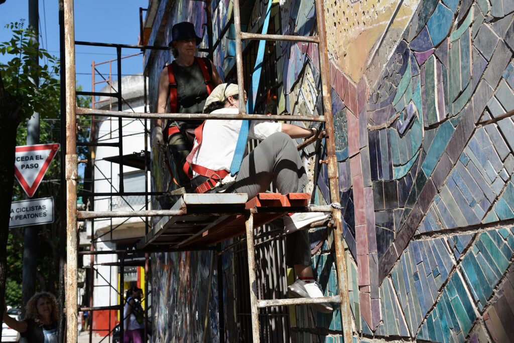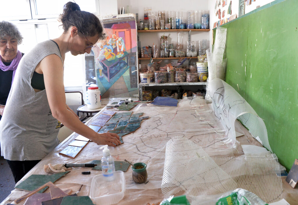 «Los martes para nosotros son sagrados», dice Correa. El trabajo es lento pero constante, y se complementa con momentos de formación y visitas a murales y obras de referencia. Nadie llegó al proyecto como especialista: «Ninguno tenía mucha experiencia en mosaico», recuerda Goldzman y añade que «todos aprendimos a cortar, esmaltar, armar piezas. Es un proceso de creación constante y de transmisión».