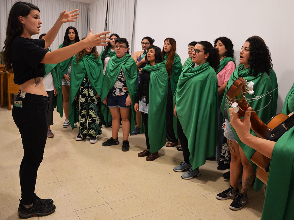 A pesar del calor, se colocan largas capas verdes para ensayar, mientras cuentan anécdotas del último viaje que hicieron, para actuar en el 38º Encuentro Plurinacional de Mujeres y Disidencias en Corrientes. Giraudo relata los inicios: «Nos conocimos en el año 2019 a partir de un grupo de Facebook que llamamos Feministas Trabajando, que funcionaba como bolsa de trabajo para emprendedoras; allí alguien propuso organizar un coro y en un rato se anotaron muchísimas y yo que recién egresaba como Técnica en Dirección Coral me entusiasmé mucho con el proyecto y les propuse audicionar. Quedaron 40 integrantes». En esas instancias, recuerda, tuvo la oportunidad de conocerlas personalmente a cada una y después de la audición de voces también hubo confidencias: «Me sentí muy conmovida cuando les preguntaba sobre las motivaciones personales para integrar este proyecto porque la mayoría decía lo mismo: “quiero un espacio para sanar, poder ser yo, sentirme acompañada, que la voz sea arte y herramienta de lucha”». Después de esa larga jornada de audición y charlas, cantaron «Reverdecer», de Perota Chingó, prendieron una fogata y arrojaron papeles con un deseo escrito sobre el espacio coral que querían construir.