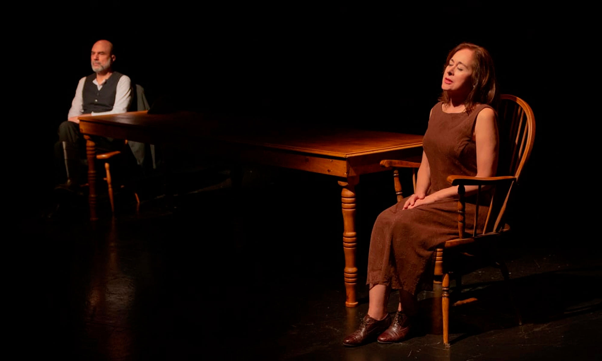 Con dirección de Facundo Ramírez, el primer gran hallazgo de esta puesta es de orden plástico: apenas se ilumina, tenuemente, la enorme caja oscura de la Sala Solidaridad, se recorta una extensa mesa que, ubicada en diagonal, marca una tajante e inmensa distancia entre un hombre (interpretado por el mismo director) y una mujer (Marcela Ferradás), ambos sentados en sus respectivas sillas.
