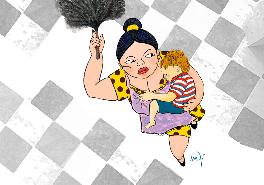 Con una mano se bastaba. Limpiaba todos los muebles de la habitación. Rociaba con un expendedor y luego la gamuza. Se estiraba hacia arriba y a veces se agachaba un poco. Entonces –se percibía apenas-, ella apretaba todavía más su brazo de hierro. Nunca dolía, más bien lo contrario; se hundía en el cuerpo de ella y el calor era más grato. Él tendía sus brazos sobre ella y solía agarrarse un poco de la tela de su vestido, sobre todo con el brazo que iba por delante de ella. La zona de su codo le rozaba un pecho. No apretaba los puñitos pero se sentía más seguro. También, le gusta sentir en sus palmas la tela del vestido de ella. Gozaba. No solo con el pitito sino con todo el cuerpo abrigado por el de ella. Estaban fundidos en una sola esfera de pertenencia y eran uno y otro completamente íntimos. Ella no lo miraba siquiera, su gesto seguía adusto y, cuando encontraba alguna dificultad con la gamuza, su boca ligeramente se torcía. En una de sus mejillas, Elena tenía una fea verruga negra, bastante protuberante. Por fortuna para él, ella lo levantaba siempre con el otro brazo y no tenía que verla. Debía de ser su brazo más fuerte. Para él, no obstante, no era un brazo fuerte meramente; era de hierro, continuidad y parte de una voluntad que estaba en ella. Lo sostenía y lo apretaba su voluntad, ese poder que emergía en tanto los dos se fundían en una intimidad en presente. Gozaba con el poder de Elena –él no sabía, claro, todo aquello que intuía– en tanto era un poder solamente actual. Era un poder que estaba en lo que para él era un paseo y duraba un rato. Era un poder en ese espacio, en ese contexto, y él era un gozador al cual se le daba ese placer por razones que ignoraba pero que estaba seguro de que existían. Era el gozador en su goce porque no había en el goce sino legitimidad, razones últimas. A veces sí, a veces apretaba sus puñitos y aferraba la tela.