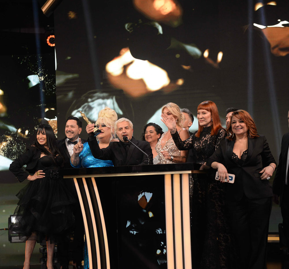 Clímax. De Brito y su troupe de «angelitas» celebran la obtención del Martín Fierro.