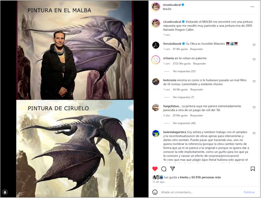 La discusión sobre el plagio en el arte volvió a estar, una vez más, en el candelero. Todo comenzó hace unas semanas cuando el reconocido artista Gustavo «Ciruelo» Cabral publicó en Instagram un texto en el que expresaba: «Visitando el Malba, me encontré con una pintura expuesta que me resultó muy parecida a una pintura mía de 2005 llamada “Dragon Caller”». La obra en cuestión es una de las que, hasta el 13 de octubre, se exhiben en la sala del subsuelo del museo porteño, en el marco de la muestra El desentierro del diablo, de la artista emergente Carrie Bencardino.