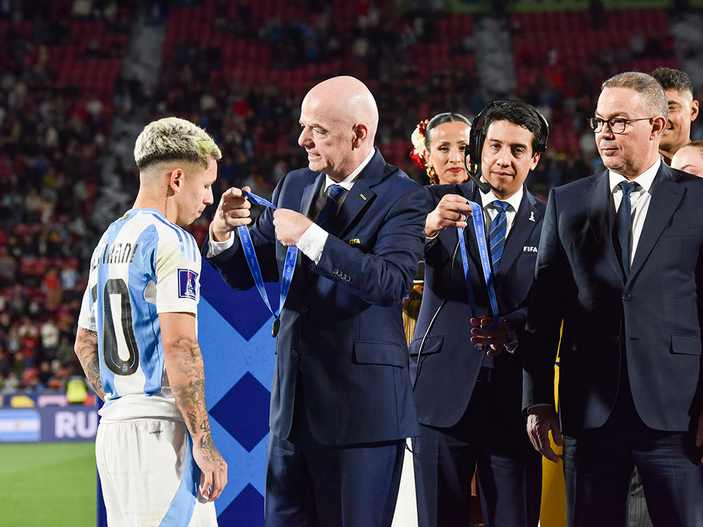Santiago. Gianluca Prestianni, una de las figuras albicelestes, recibe la medalla de plata de manos del presidente de FIFA, Gianni Infantino.