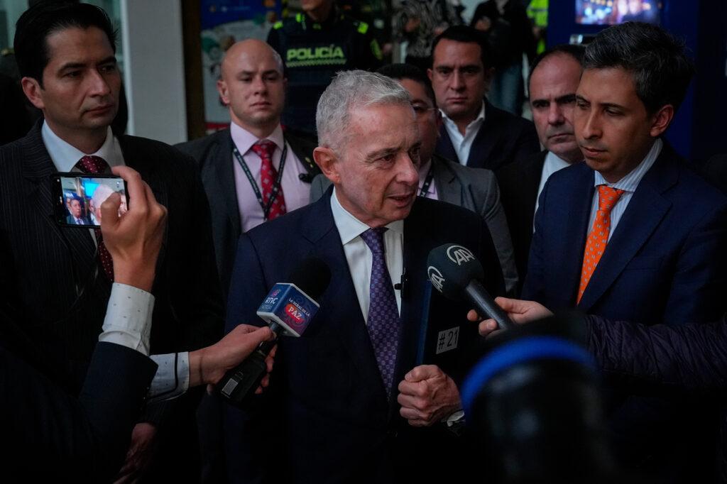 Expresidente. Uribe frente a la prensa, tras declarar en la causa judicial en su contra, en mayo de 2025.