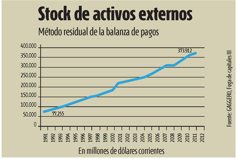 Como ejemplo, basta recorrer los últimos 45 años para tomar real dimensión del tema. En 1970 el stock de capitales acumulados en el exterior ascendía a 921 millones de dólares. Casi 20 años después (1989) alcanzaba los 43.078 millones. Durante los 7 años de la dictadura cívico-militar, tuvo lugar el mayor crecimiento de este mecanismo: entre 1975-1983, trepó de 3.566 millones a 32.214 millones de dólares. No obstante, la recuperación del sistema democrático no revirtió la modalidad. Entre 1992 y 2001 –vigencia de la Convertibilidad– la salida de activos al exterior se ubicó entre los 60.000 y 73.000 millones de dólares, alcanzando en 2001 los 120.000 millones de dólares. Poco más de una década después, en 2012, y de acuerdo al trabajo de Jorge Gaggero Fuga de capitales III. Argentina (2002-2012) utilizando el método residual de balanza de pagos, el stock de capitales fugados alcanza los 373.912 millones de dólares (ver recuadro).