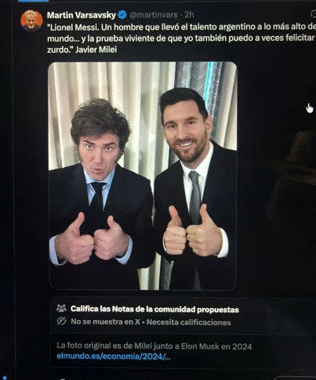 En Miami Milei se perdió una nueva foto con Trump, como hubiera deseado, y también con Lionel Messi, al que sus allegados trataron en vano de convencer. De hecho, el campeón mundial había hablado en el foro un día antes. El entusiasmo fanático de algunos de los seguidores de Milei lleva a que a veces caigan en trampas, como le ocurrió esta vez a Martín Varsasvky, que posteó en su cuenta de X una imagen que pronto fue desmentida por las Notas de la Comunidad de la plataforma. Había sido trucada de una foto del presidente con el empresario Elon Musk, de cuando el dueño de Tesla y Space X todavía no había caído en desgracia con la Casa Blanca.