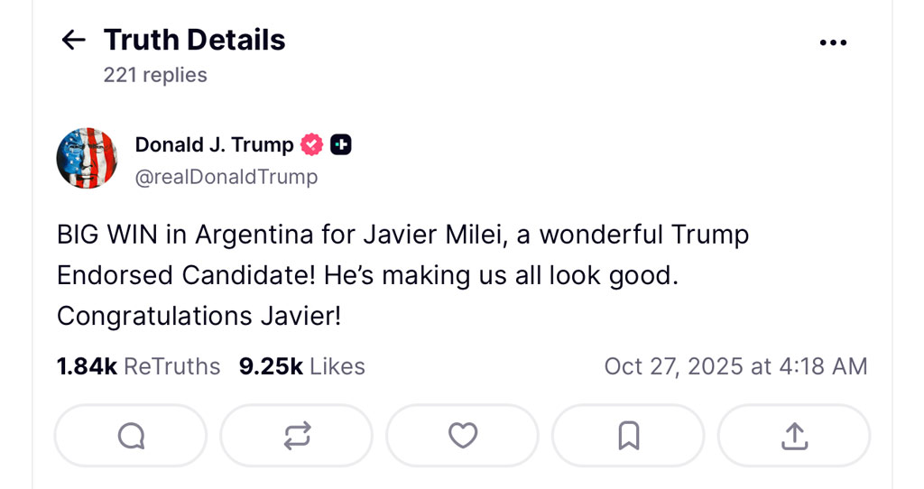 En resumidas cuentas, Javier Milei obtuvo un aval impensado hasta días antes para concretar un modelo económico-político que llegó al 26 de octubre con la lengua afuera, sostenido por la ayuda del Gobierno de Estados Unidos. Si alguien debería haberse subido al escenario montado en el Hotel Libertador quizás fuera Scott Bessent, el secretario del Tesoro, o directamente Donald Trump, que a su manera se puso la cocarda: «¡Gran triunfo en Argentina para Javier Milei, un candidato maravilloso respaldado por Trump! Nos está dejando a todos en una buena posición. ¡Felicidades, Javier!», escribió en su red Truth