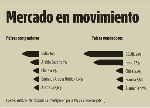 El informe del organismo sueco, publicado en febrero y titulado Tendencias mundiales en las transferencias de armas, reafirmó la posición de liderazgo que mantienen los dos principales exportadores de armamento a nivel global: Estados Unidos y Rusia. En lo que podría considerarse una reedición de la carrera armamentística del siglo pasado, los datos indican que la Casa Blanca acapara el 33% del negocio, mientras que el Kremlin posee el 25%. Sin embargo, y a diferencia de lo que ocurría en años de la Guerra Fría, la producción de armamento no está destinada tanto a la defensa interna, sino más bien al suministro de otros ejércitos. Un negocio que aporta millones de dólares a las potencias y que, paralelamente, deja un sendero de sangre en los países más pobres del mundo.